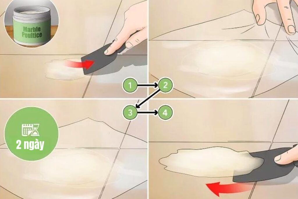 Dùng bột đắp rút vết bẩn trên đá cẩm thạch nếu các phương pháp khác không có tác dụng. Đắp một lớp bột dày lên vết bẩn và để trong 1-2 ngày trước khi lau sạch.