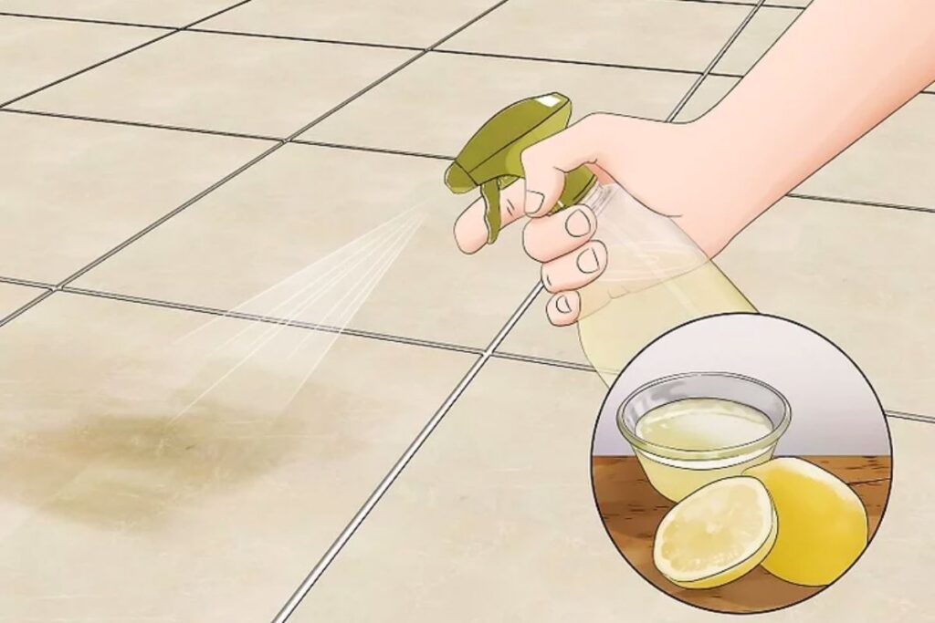 Xịt nước cốt chanh lên các vệt nước cứng trên gạch lát hoàn thiện. Nước cốt chanh có nồng độ axit cao, giúp đánh tan các vết nước cứng.