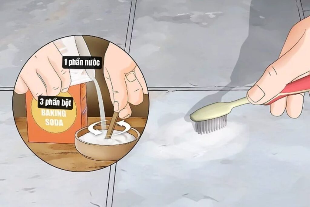 Trộn muối nở với nước để làm sạch gạch lát không phải ceramic. Dùng bàn chải đánh răng chà hỗn hợp lên vết bẩn.