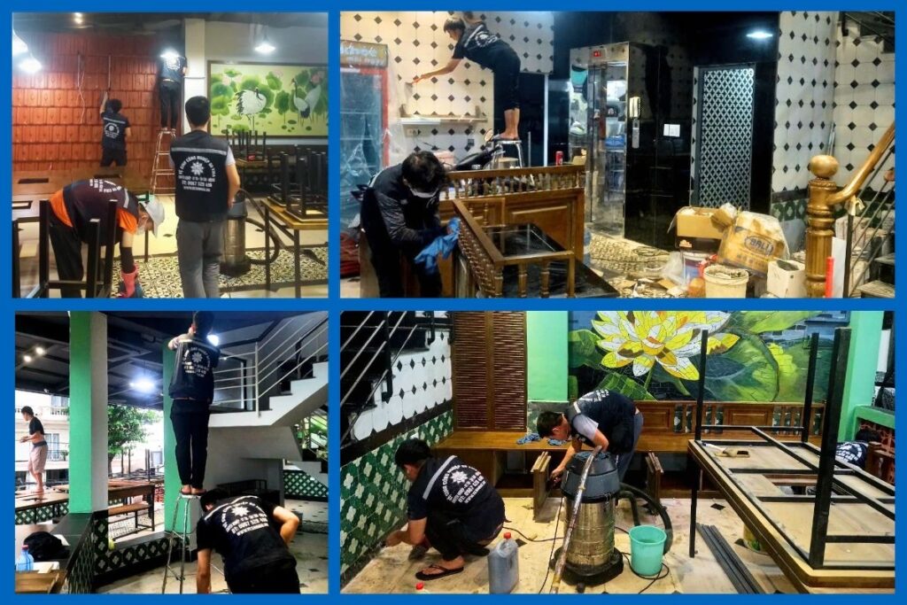• Vệ sinh khu vực ăn uống: Lau chùi bàn ghế, sàn nhà, cửa sổ và các vật dụng trang trí.