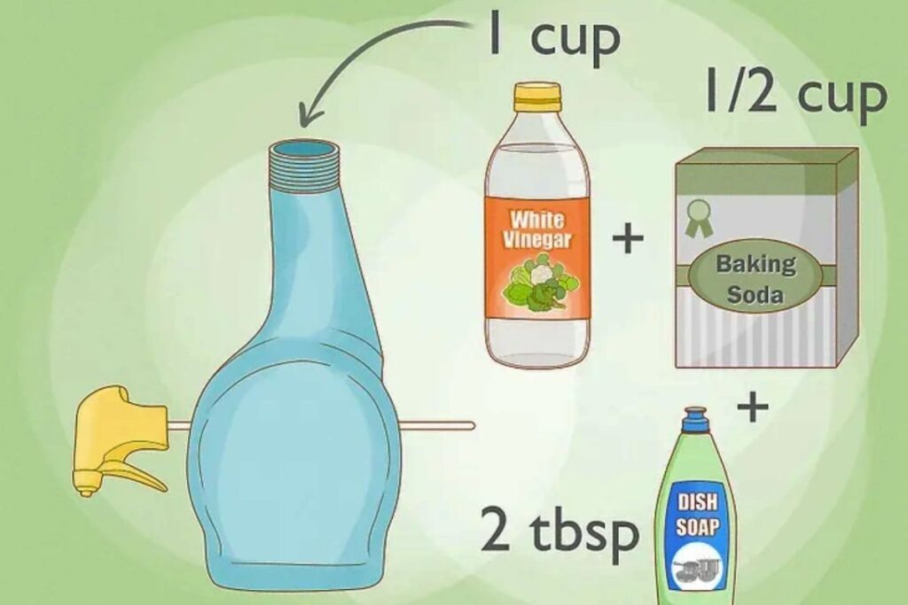 Trong một bình xịt, trộn 1 cốc giấm với 1/2 cốc baking soda. Thêm 2 thìa xà phòng rửa chén và lắc đều. Hỗn hợp này giúp loại bỏ vết bẩn và mùi hôi hiệu quả. Bạn cũng có thể thêm vài giọt tinh dầu để khử mùi tốt hơn.