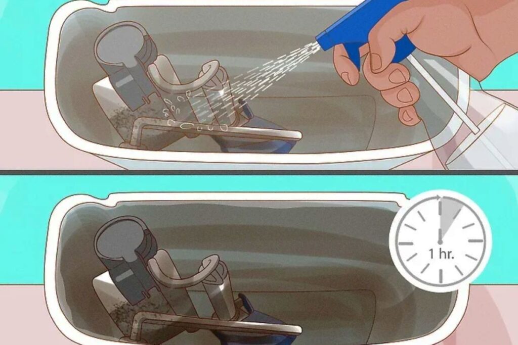 Xịt hỗn hợp giấm và baking soda vào trong bồn chứa, đảm bảo phủ kín các bề mặt. Để dung dịch yên trong khoảng 1 giờ để loại bỏ các vết bẩn cứng đầu.