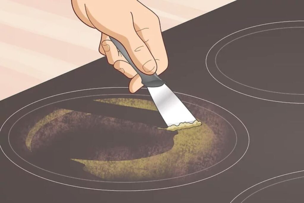 Dùng dao sủi đặt ở góc 45 độ so với bề mặt bếp. Nhẹ nhàng đẩy lưỡi cạo qua các vết bẩn để nhấc chúng ra khỏi bề mặt bếp.